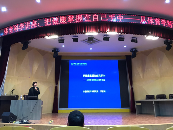 讲座开始,于素梅博士以“健康与学科核心素养的关系”为线索,从“拼命”二字出发,结合《“健康中国2030”规划纲要》,对讲座内容展开详细论述;讲座中,于博士结合真实的案例,与同学一起讨论健康的重要性及保健的方法;讲座最精彩的部分就是阐释了核心素养是培养学生的必备品格和关键能力,并且最终要明确“教育要培养什么样的人”这一问题,并将体育学科与核心素养相结合阐释了体育学科核心素养框架,从体育精神、运动实践和健康促进三个维度六大方面进行叙述;在讲座的尾声,于博士从身体健康、心理健康及社会适应三个方面发问,“我们是否具有健康需要的素养”,并给予具体分析。