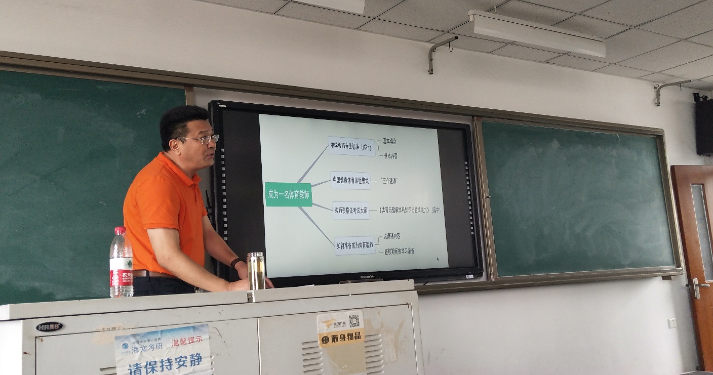 葛书林教授围绕“中学体育教师的标准”这一主题,从谈体育教师本质逐渐切入中学体育教师的特质,他用生动的语言、翔实的例证为大家介绍了中学体育教师标准的设定思想、建设理念以及专业发展路径,深入分析了体育教师的学科专业知识、教师职业能力与体育专业能力的构成,讲解了中学体育教师的专业标准、体育教师资格考试对学院本科专业、研究生教育的课程设置,谈了对体育教学工作的启示。同时,他还结合体育教师职业素养、体育教师专业能力发展给出了在校大学生专业学习与发展的建议,给出了学生教师资格证考试、教师考录、研究生报考的有针对性的具体意见。