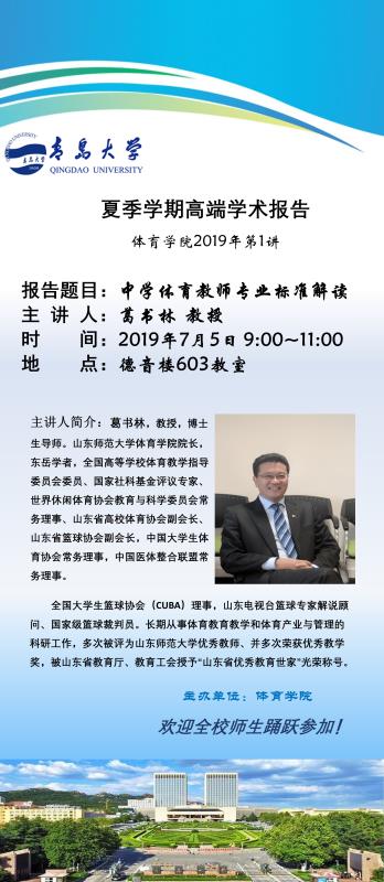 2019年7月5日9:00,山东师范大学博士生导师、德赢winac米兰院长葛书林教授应邀来德赢在德音楼603教室举办一场题为“中学体育教师专业标准解读”的专题讲座,本次讲座由德赢winac米兰管泽毅院长主持,学院党委副书记姜琳、副院长矫志庆以及体育系矫洪申主任等多名学院领导、教师参加了本次活动。2016级、2017级、2018级全体本科生及体育专业在校研究生聆听了葛教授的讲座。